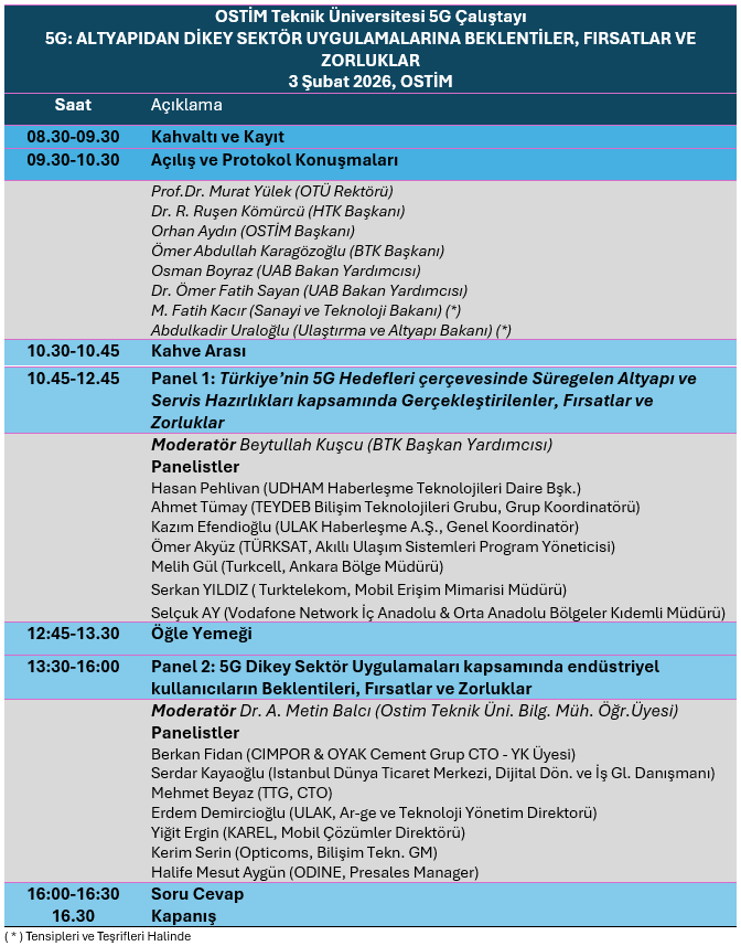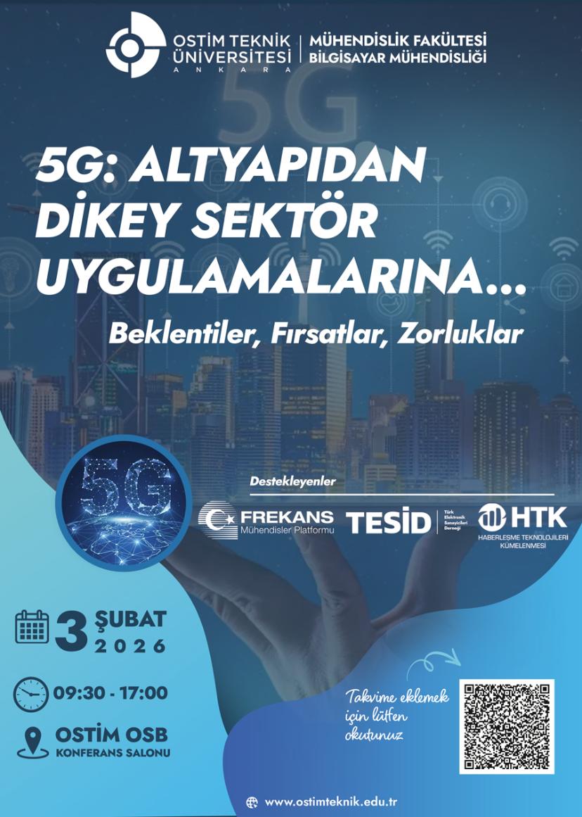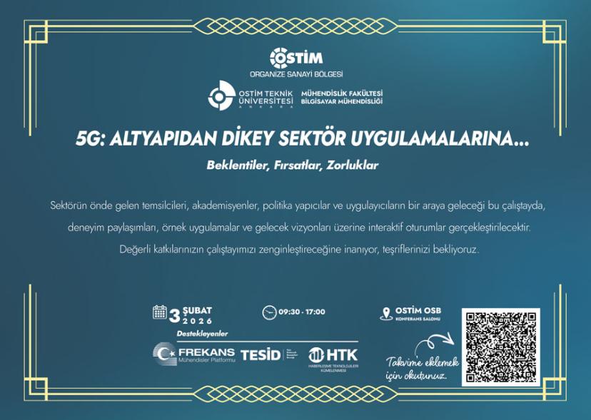Teknolojideki gelişmeleri endüstri ve sanayi ile buluşturma görevini en iyi şekilde yerine getirmeye çalışan Ostim Teknik Üniversitemizin koordinesinde, OSTİM ev sahipliğinde, HTK, TESİD ve Frekans Mühendisler Platformu destekleriyle 5G: Altyapıdan Dikey Sektör Uygulamalarına; Beklentiler, Fırsatlar, Zorluklar konulu bir çalıştayı 3 Şubat 2026 Salı günü gerçekleştirmeyi planlamaktayız.